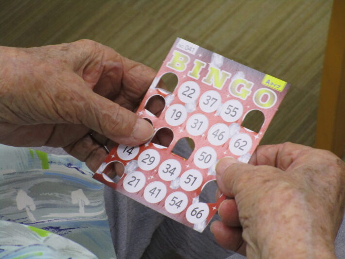 次はビンゴゲームをしました。箱の中から、数字が書いてあるキャップを順番に引いてもらいました。手元の紙を見ながら、「あったわ。」といって嬉しそうに穴を開けている方がいれば、「そんな数字ないよ。」と落ち込みながらも次の数字を待つ人もいて、皆さん一喜一憂しながらも、全員がビンゴするまで楽しまれました。