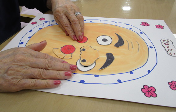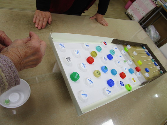 福笑いの出来上がりをお互いに見て笑いあったり、ビー玉落としは「昔こういうゲームがあったんよ」と若い頃を懐かしんだりして楽しんで頂けていました。