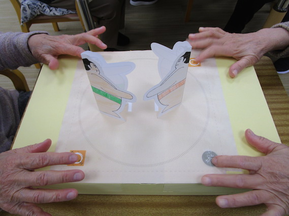 今年最初のレクリエーションは、毎年恒例の福笑いと紙相撲、ビー玉落としを行いました。