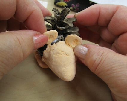 紙粘土で顔、耳、足を作り松ぼっくりにくっつけ目を描いて完成です。